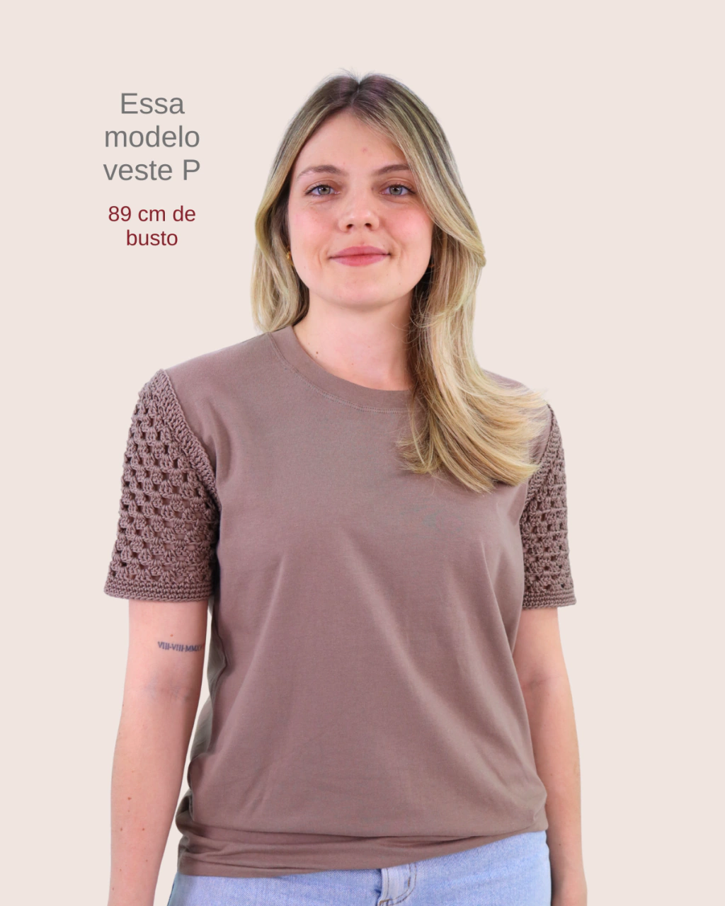 - Feito á mão desde a confecção da camiseta até as mangas em crochê