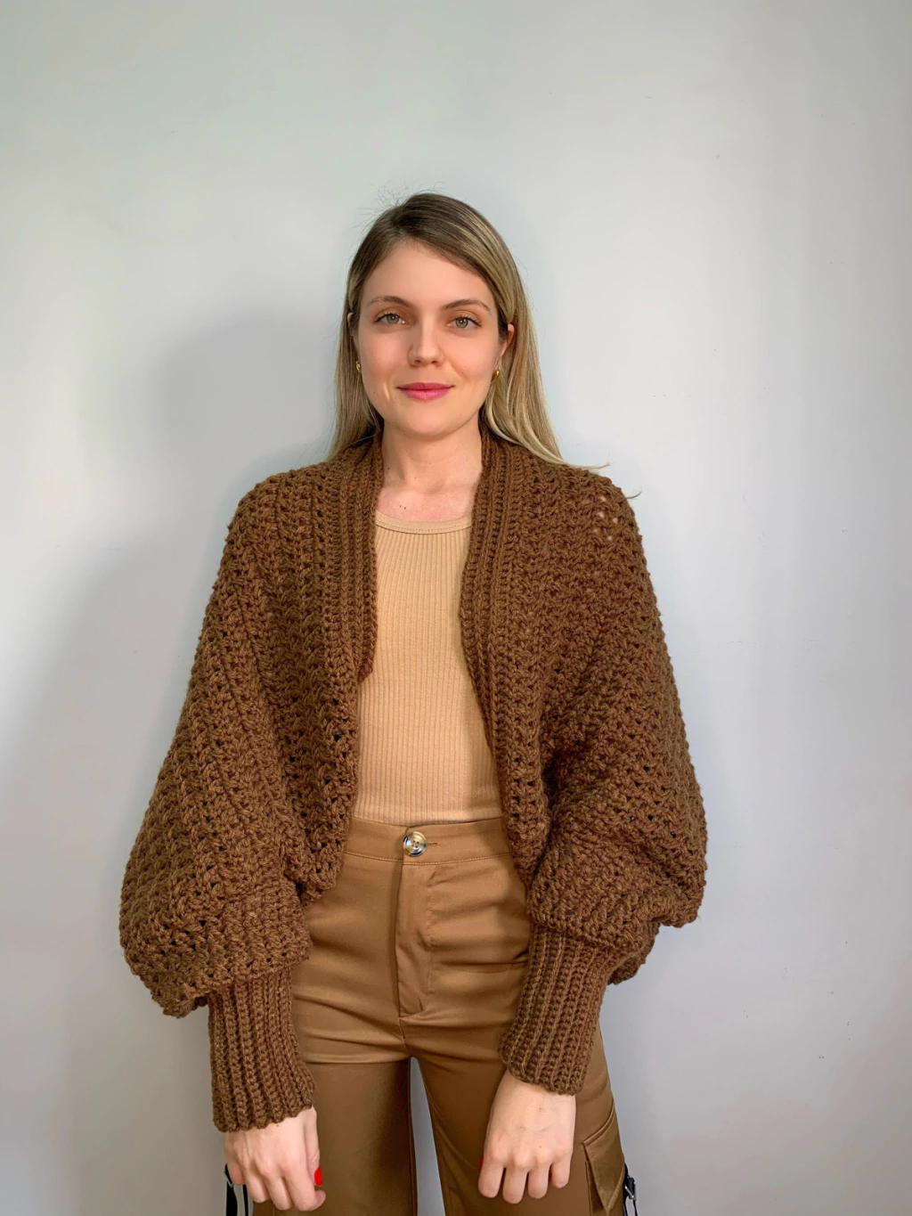 Esse modelo de casaco é tamanho único. Recomendamos para mulheres com busto de 85cm a 115cm.